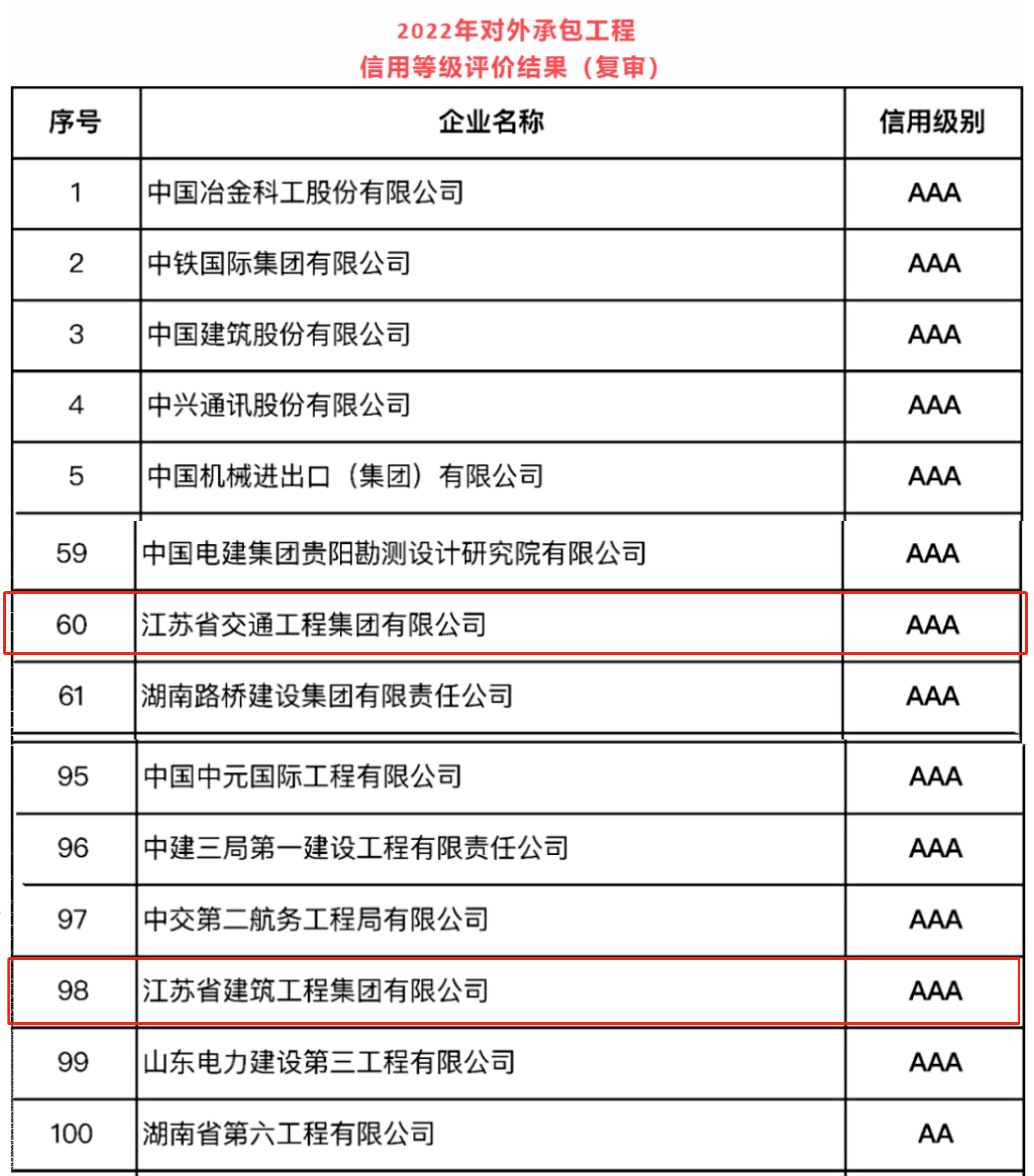 11月14日(rì),中國(guó)對外承包工(gōng)程商會正式公布了企業信用等級評價結果,江蘇省建集團及旗下江蘇交工(gōng)集團通過複審再次獲評AAA級企業信用等級,彰顯了在對外承包工(gōng)程領域的行業競争力和海外業務的綜合實力。